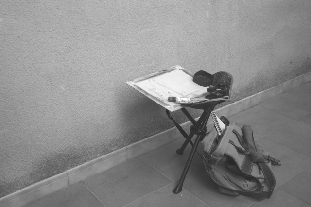 Había que contar con que el trabajo se llevaría a cabo a la intemperie, a pie de calle, en lugares muchas veces de tránsito con ocasionales observadores. También el tiempo dedicado a cada uno de los dibujos sería limitado y se buscaría concluirlo en una sola sesión.
