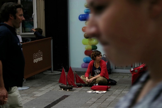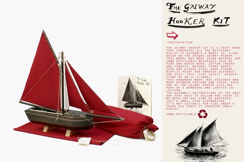 Juguete desmontable en madera, tela e instrucciones de montaje, venta callejera.