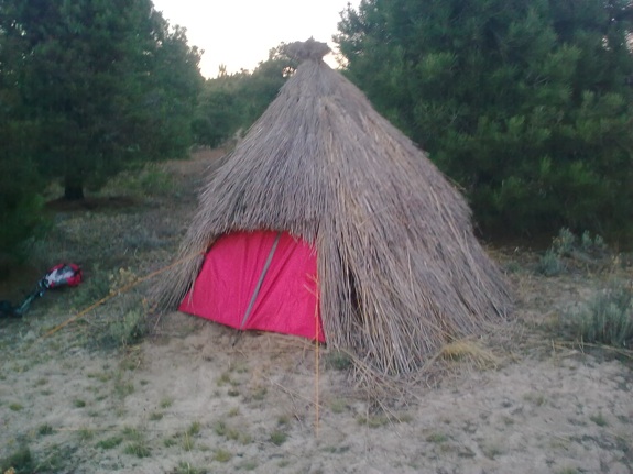 Voy a montar la tienda en el interior de una choza que construimos hace tiempo en este lugar, para ello, he de reparar previamente la cubierta de hierbas y carrizos y preparar el suelo para hacerlo mas confortable...